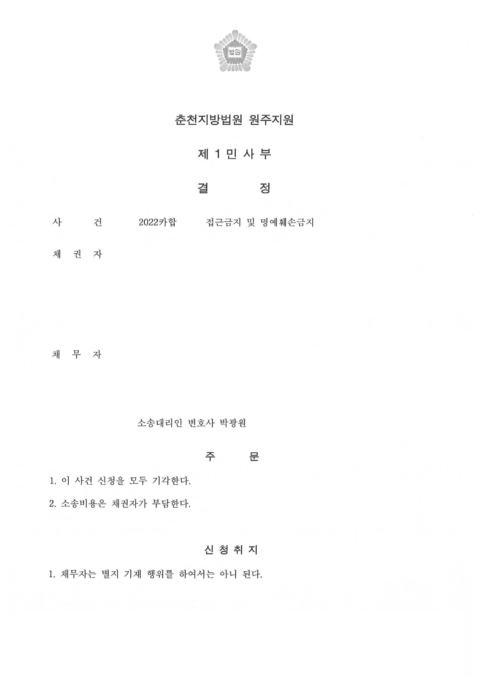 Á¦¸ñ [¹Î»ç]»ó´ë¹æÀÌ Á¢±Ù±ÝÁö ¹× ¸í¿¹ÈѼձÝÁö ½ÅûÀ» ÇßÀ¸³ª ÀüºÎ ±â°¢ °áÁ¤À» ¹ÞÀº ¼º°ø»ç·Ê